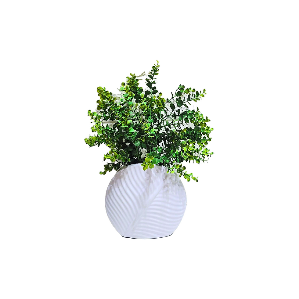 12" Faux Eucalyptus in Round Flat Tropical Print Vase